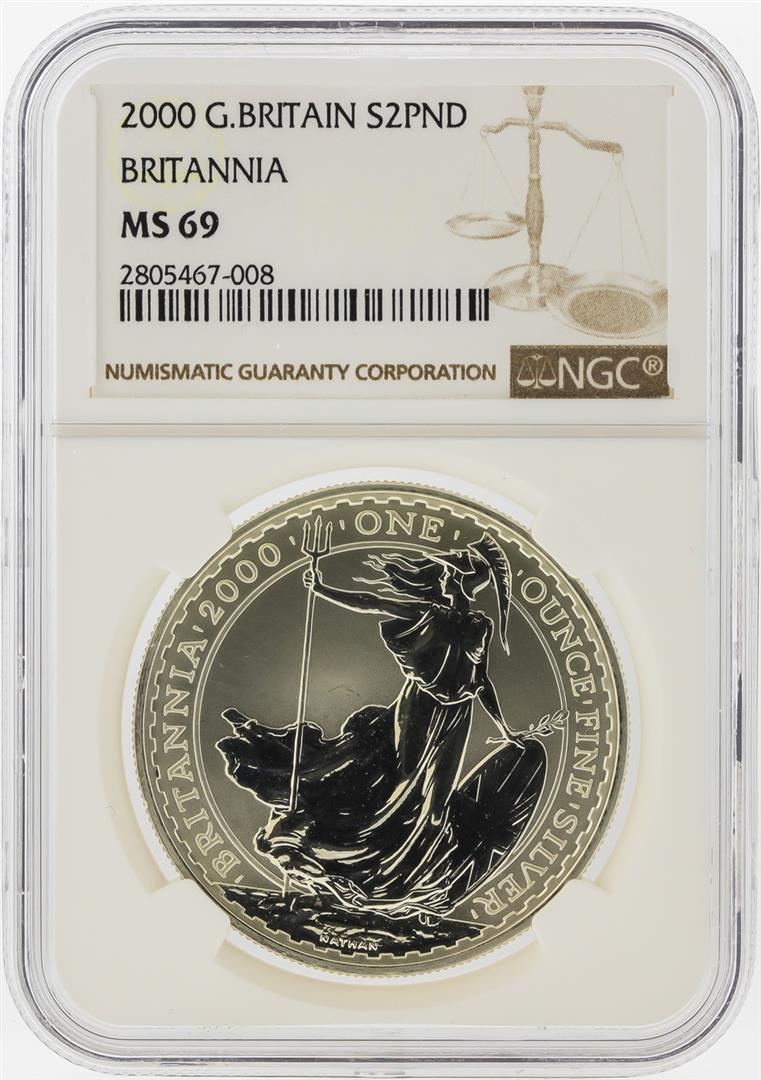 One 2000 Great Britain 2 Pound Britannia Silver Coin NGC MS69. NGC Certified.