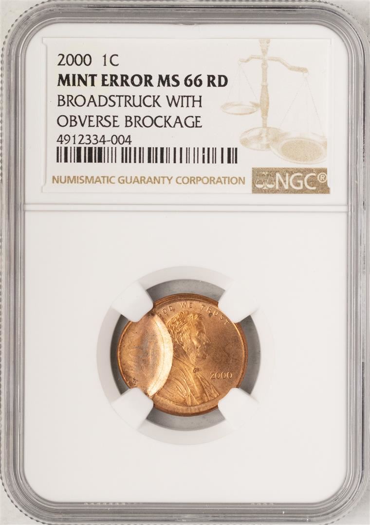 One 2000 Lincoln Cent Coin Broadstruck w/ Obverse Brockage NGC Mint ERROR MS66RD. NGC Certified.