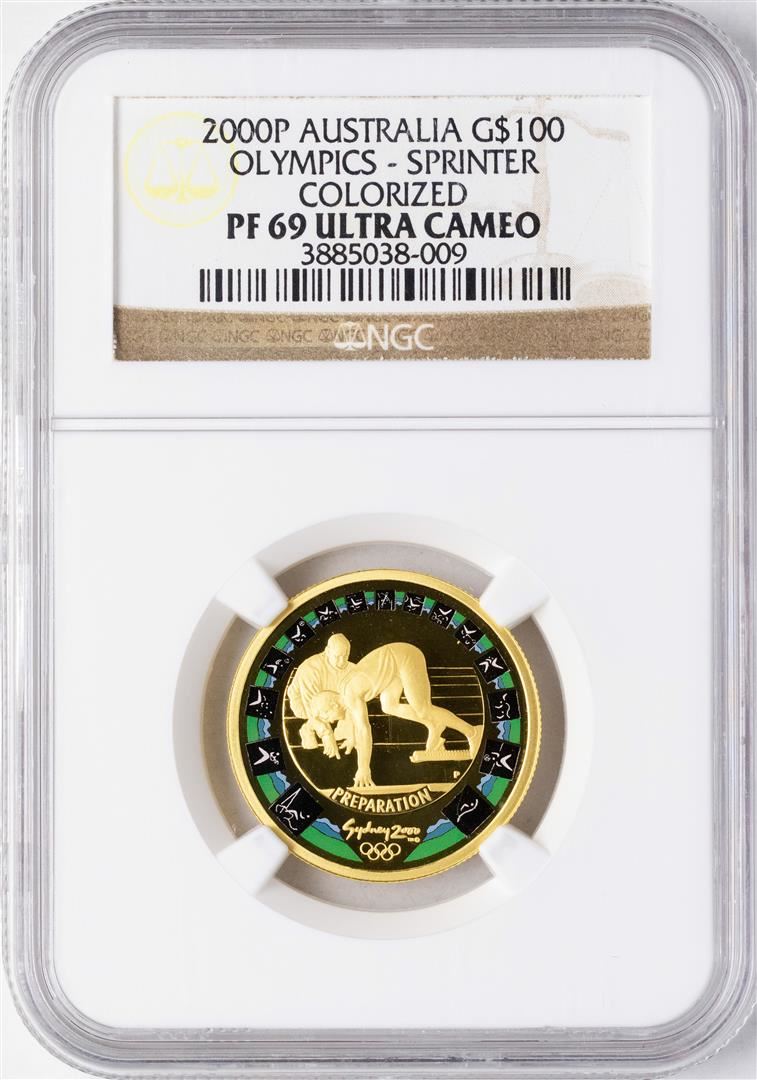 One 2000P Australia $100 Olympics Sprinter Commemorative Gold Coin NGC PF69 Ultra Cameo. NGC Certified.