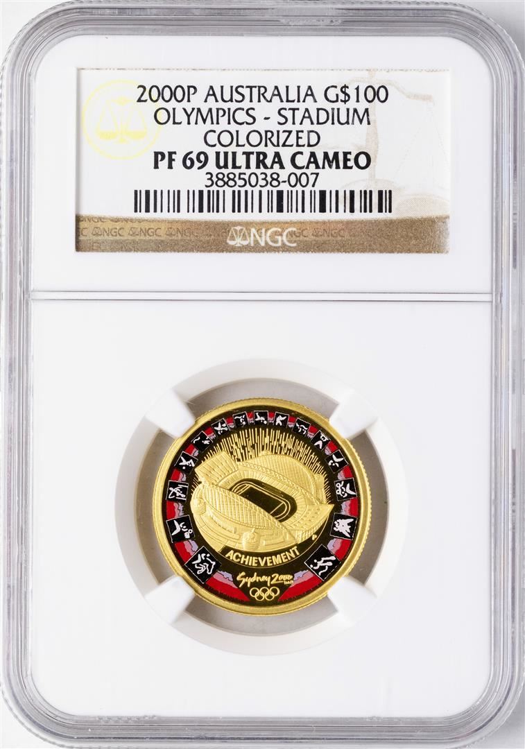 One 2000P Australia $100 Olympics Stadium Commemorative Gold Coin NGC PF69 Ultra Cameo. NGC Certified.