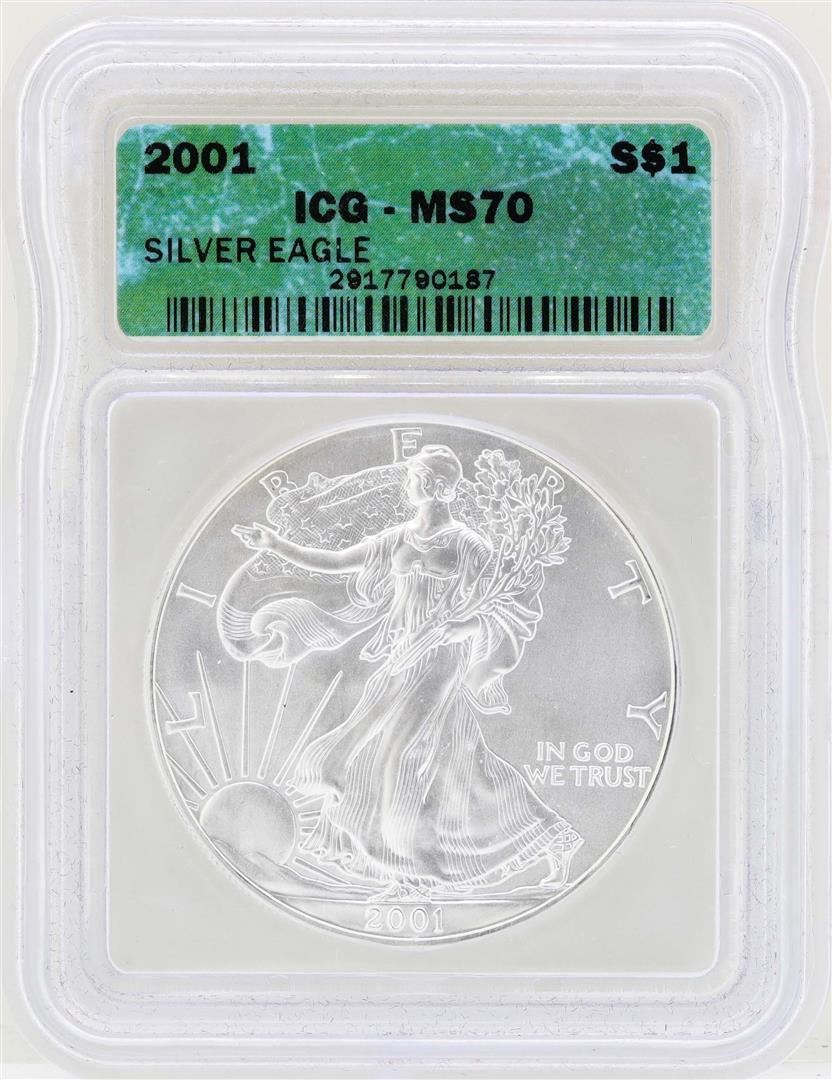 One 2001 $1 American Silver Eagle Coin ICG MS70. ICG Certified.