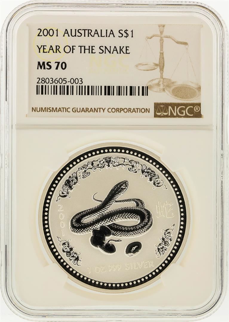 One 2001 $1 Australia Silver Lunar Series Year of the Snake Coin NGC MS70. NGC Certified.