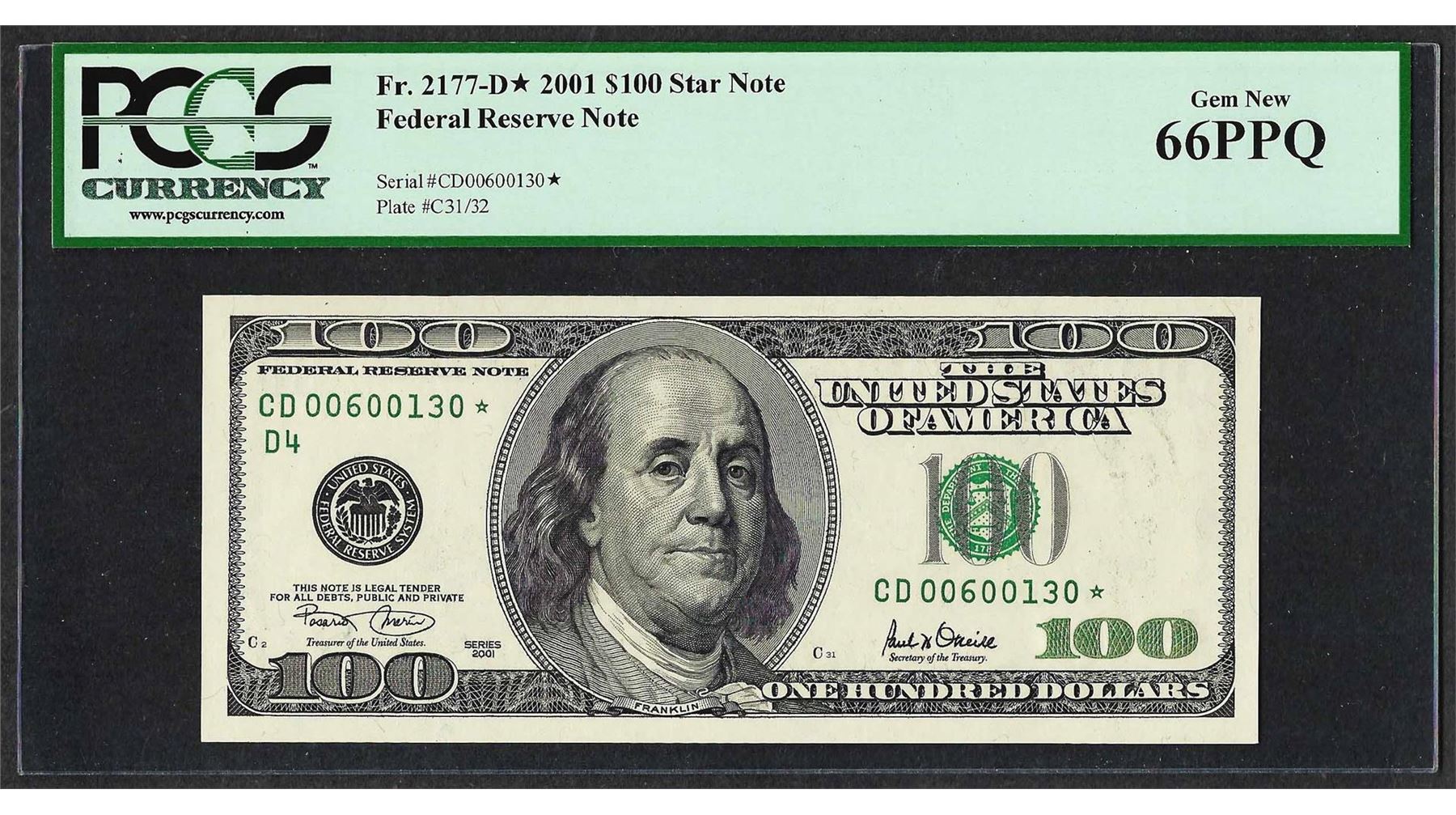 One 2001 $100 Federal Reserve STAR Note PCGS Gem New 66PPQ. PCGS Graded.