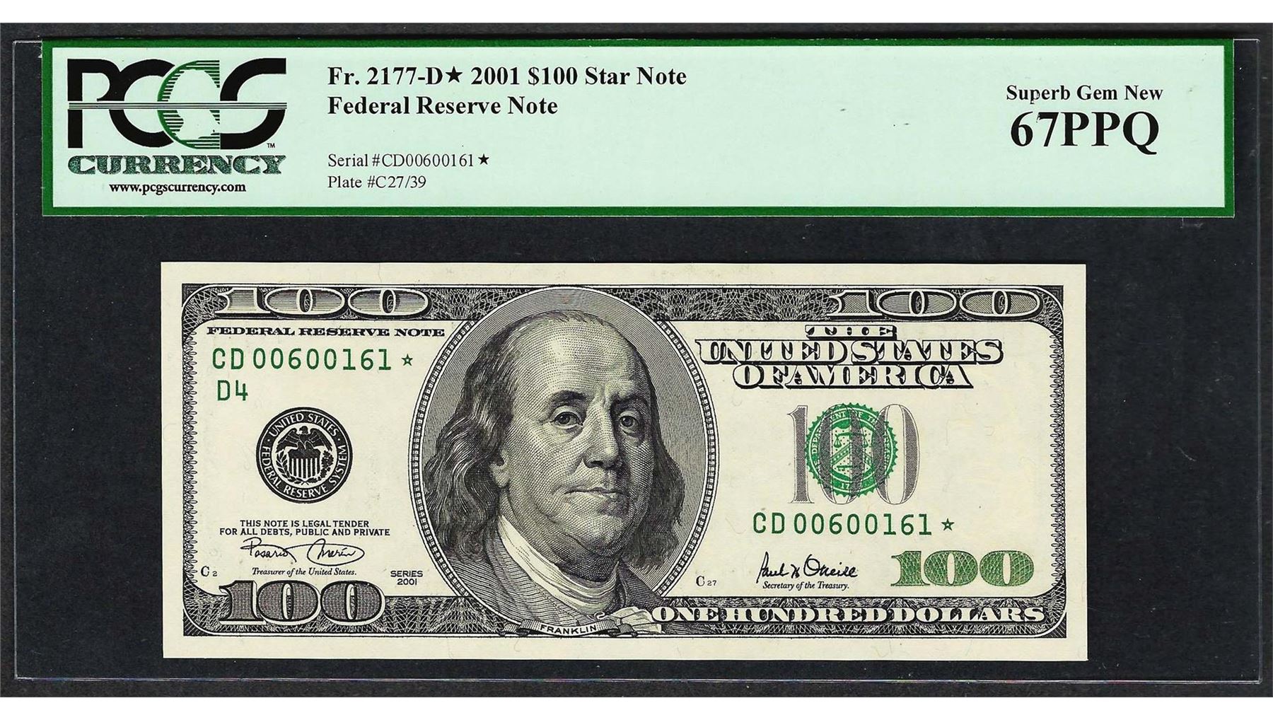 2001 $100 Federal Reserve STAR Note PCGS Superb Gem New 67PPQ