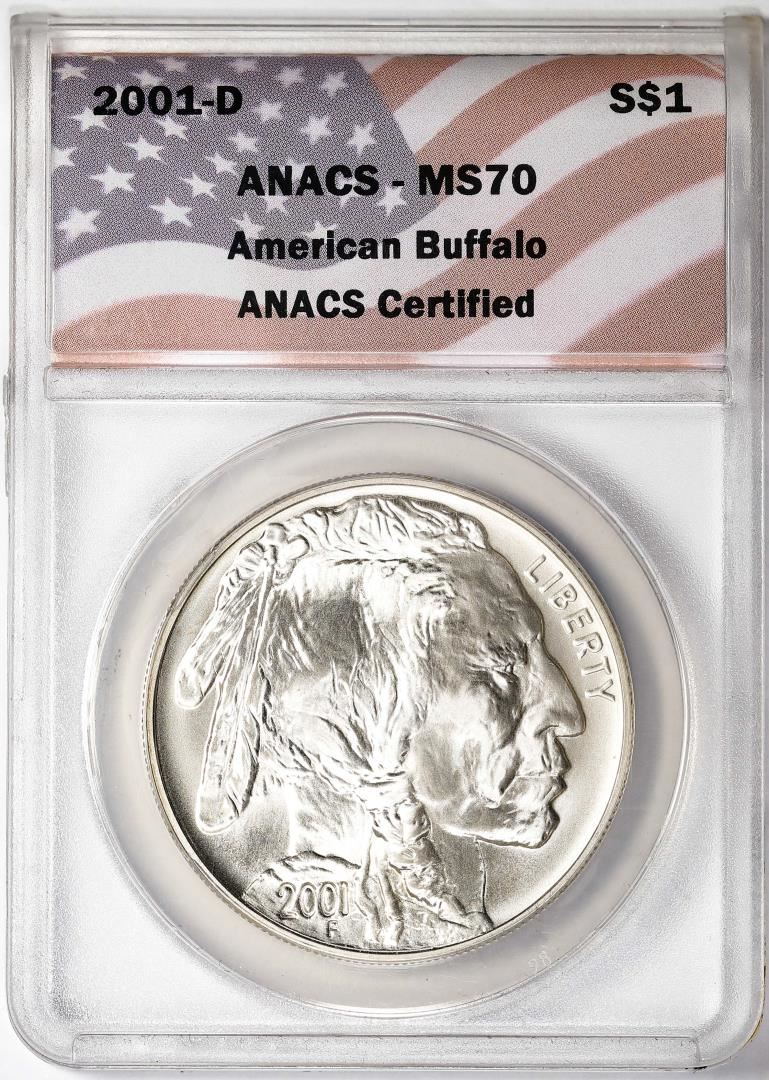 One 2001-D $1 American Buffalo Silver Dollar Coin ANACS MS70. ANACS Certified.