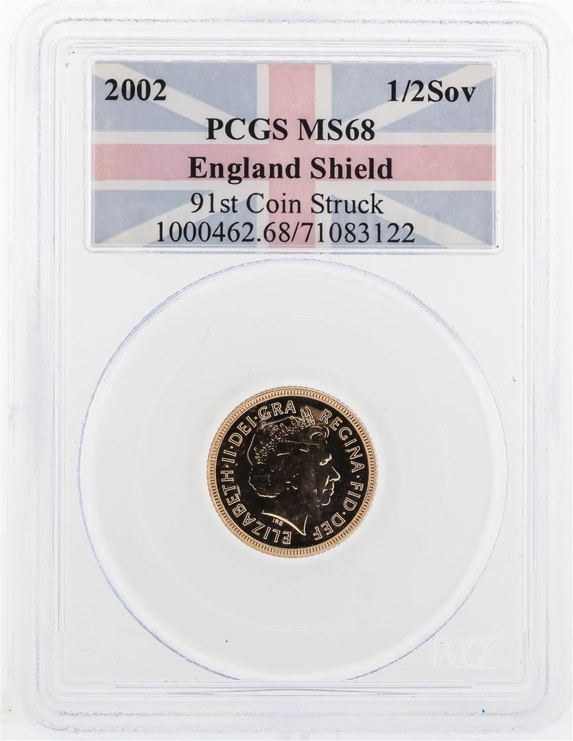 One 2002 1/2 Sovereign England Shield Gold Coin PCGS MS68. PCGS Graded.