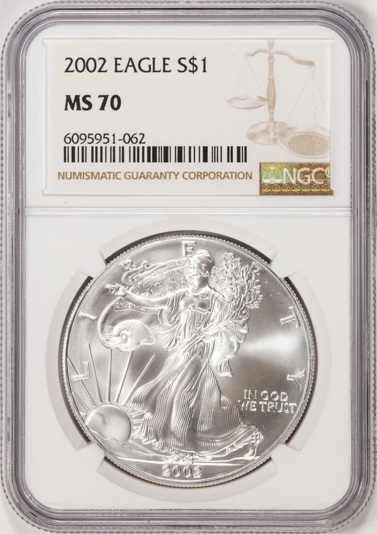 One 2002 $1 American Silver Eagle Coin NGC MS70. NGC Certified.