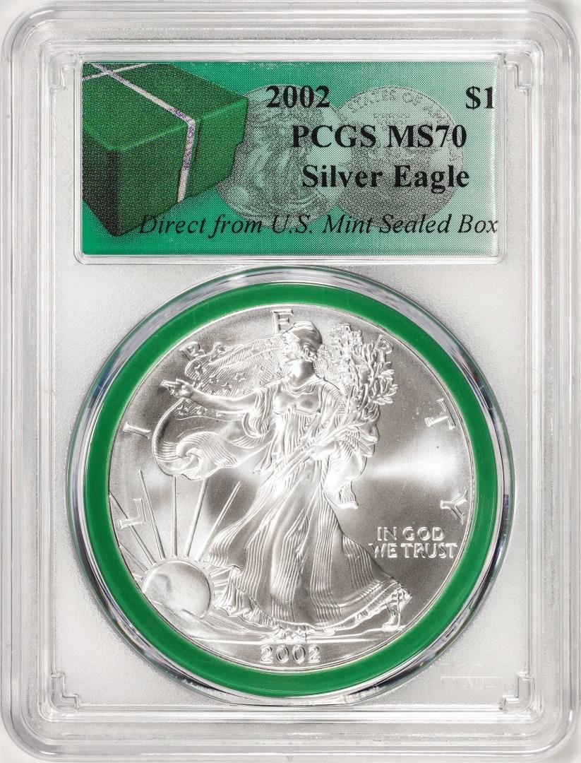 One 2002 $1 American Silver Eagle Coin PCGS MS70 Direct From U.S. Mint Sealed Box. PCGS Graded.