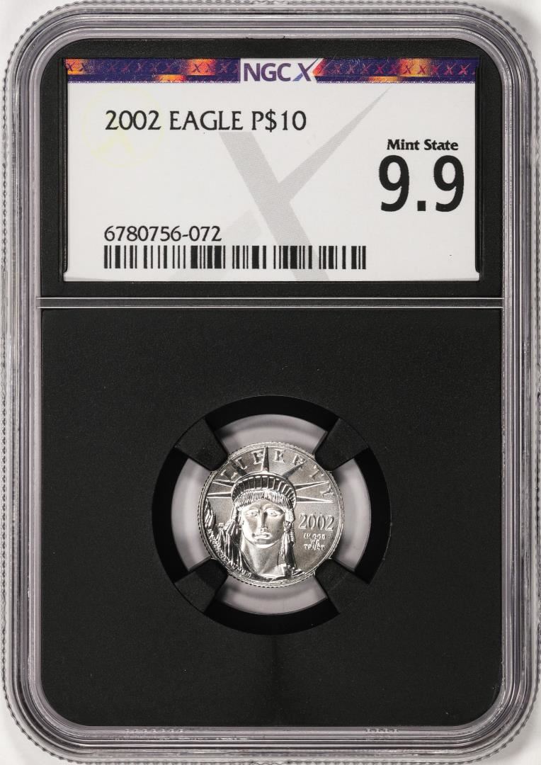 One 2002 $10 Platinum American Eagle Coin NGCX Mint State 9.9. NGCX Certified.