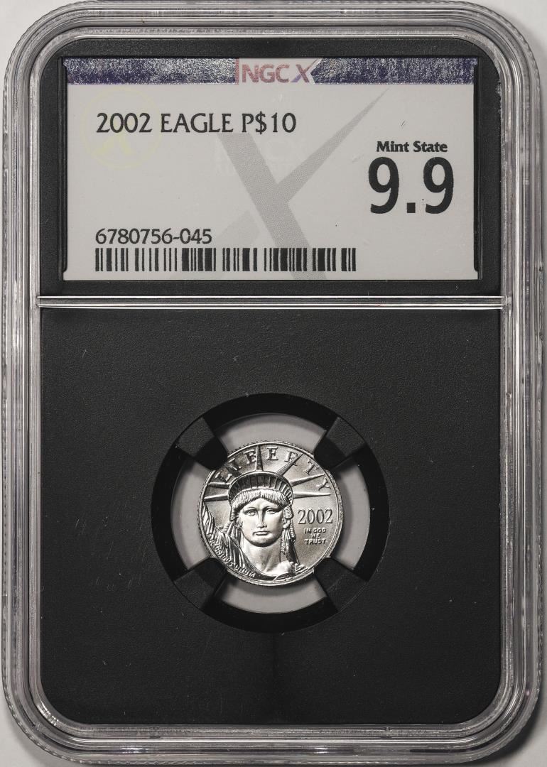 One 2002 $10 Platinum American Eagle Coin NGCX Mint State 9.9. NGCX Certified.