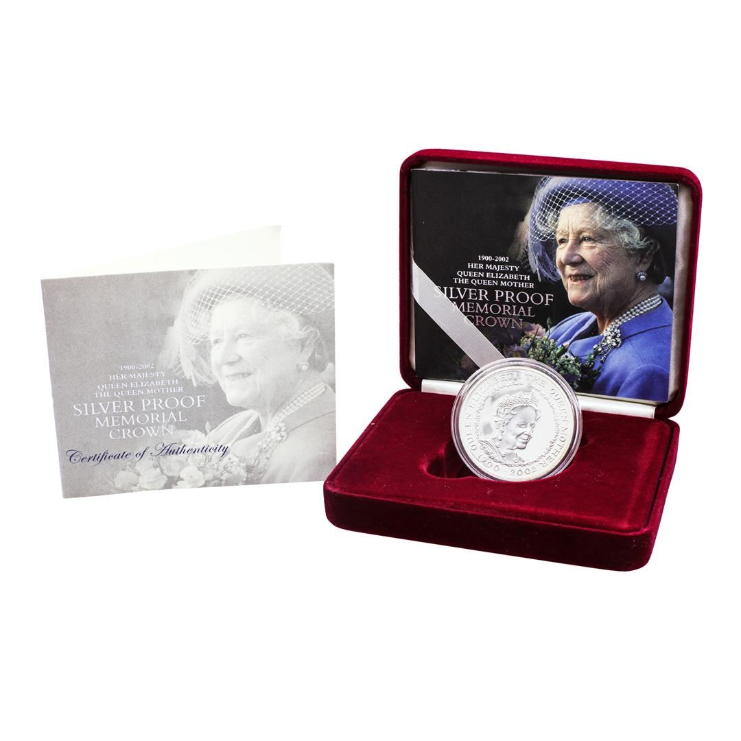 One 2002 Her Majesty the Queen Mother Silver Proof Memorial Crown Coin.
