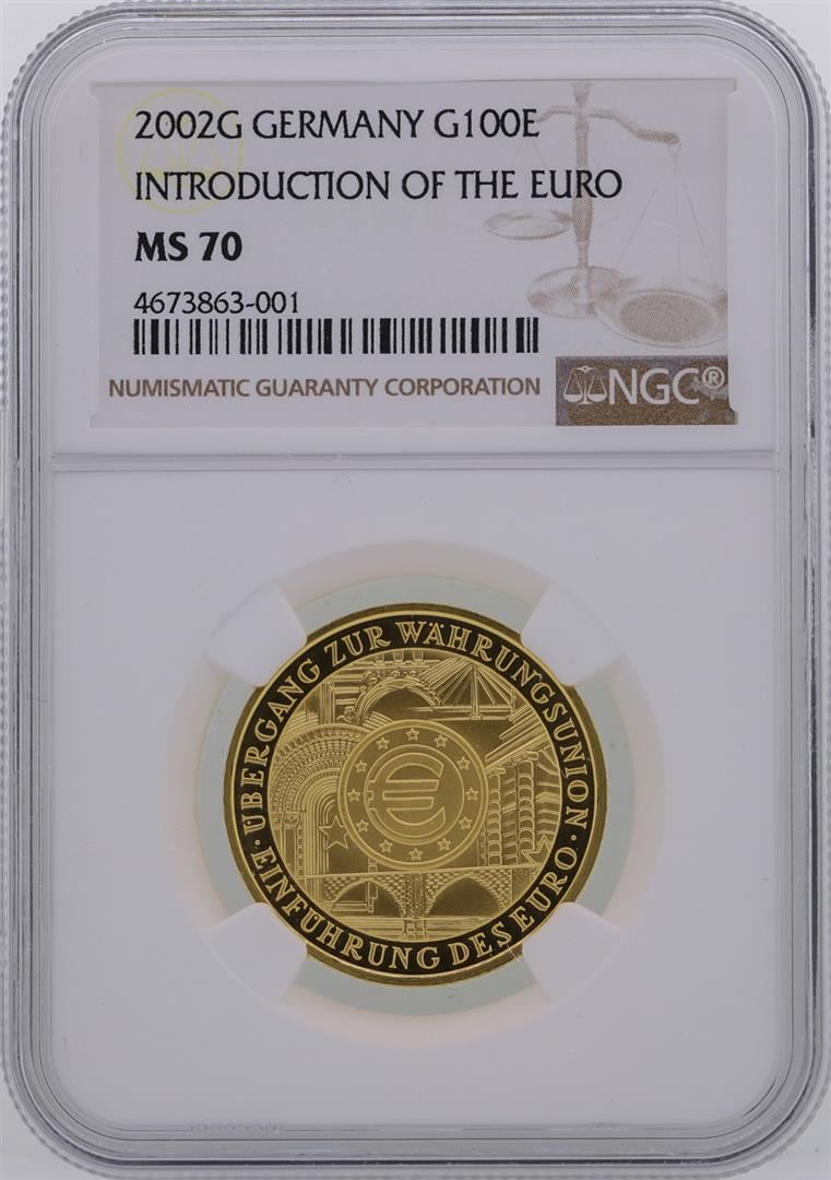One 2002G Germany 100 Euro Introduction of the Euro Gold Coin NGC MS70. NGC Certified.