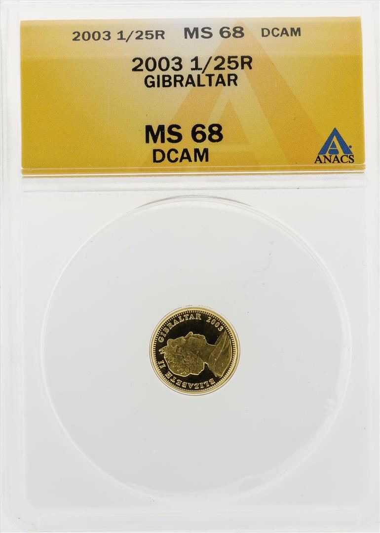 One 2003 1/25R GIBRALTAR Gold Coin ANACS MS68 DCAM. ANACS Certified.