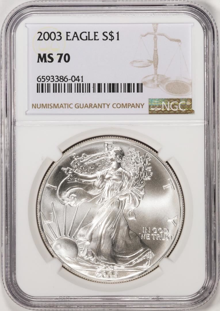 One 2003 $1 American Silver Eagle Coin NGC MS70. NGC Certified.