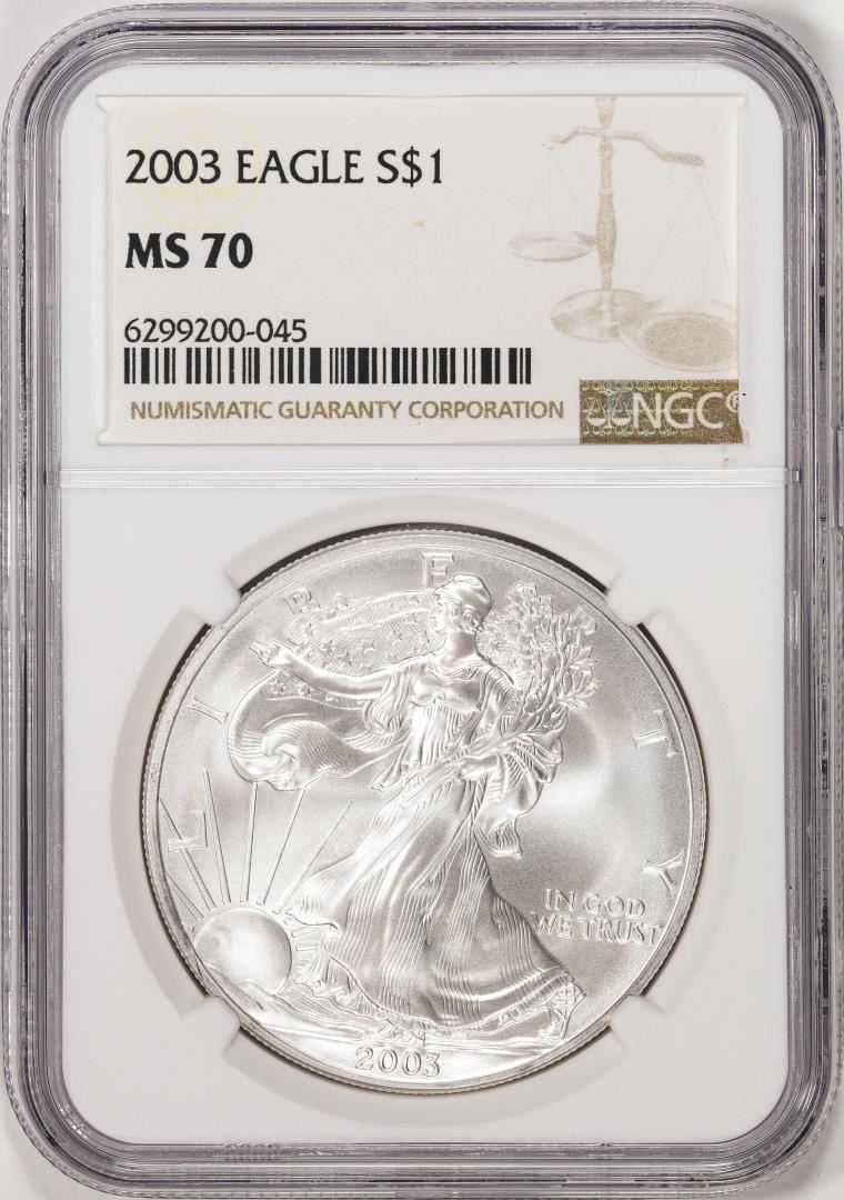 One 2003 $1 American Silver Eagle Coin NGC MS70. NGC Certified.