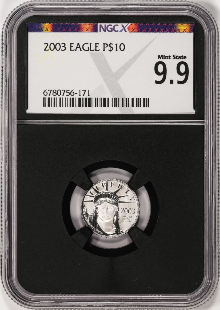 One 2003 $10 Platinum American Eagle Coin NGCX Mint State 9.9. NGCX Certified.