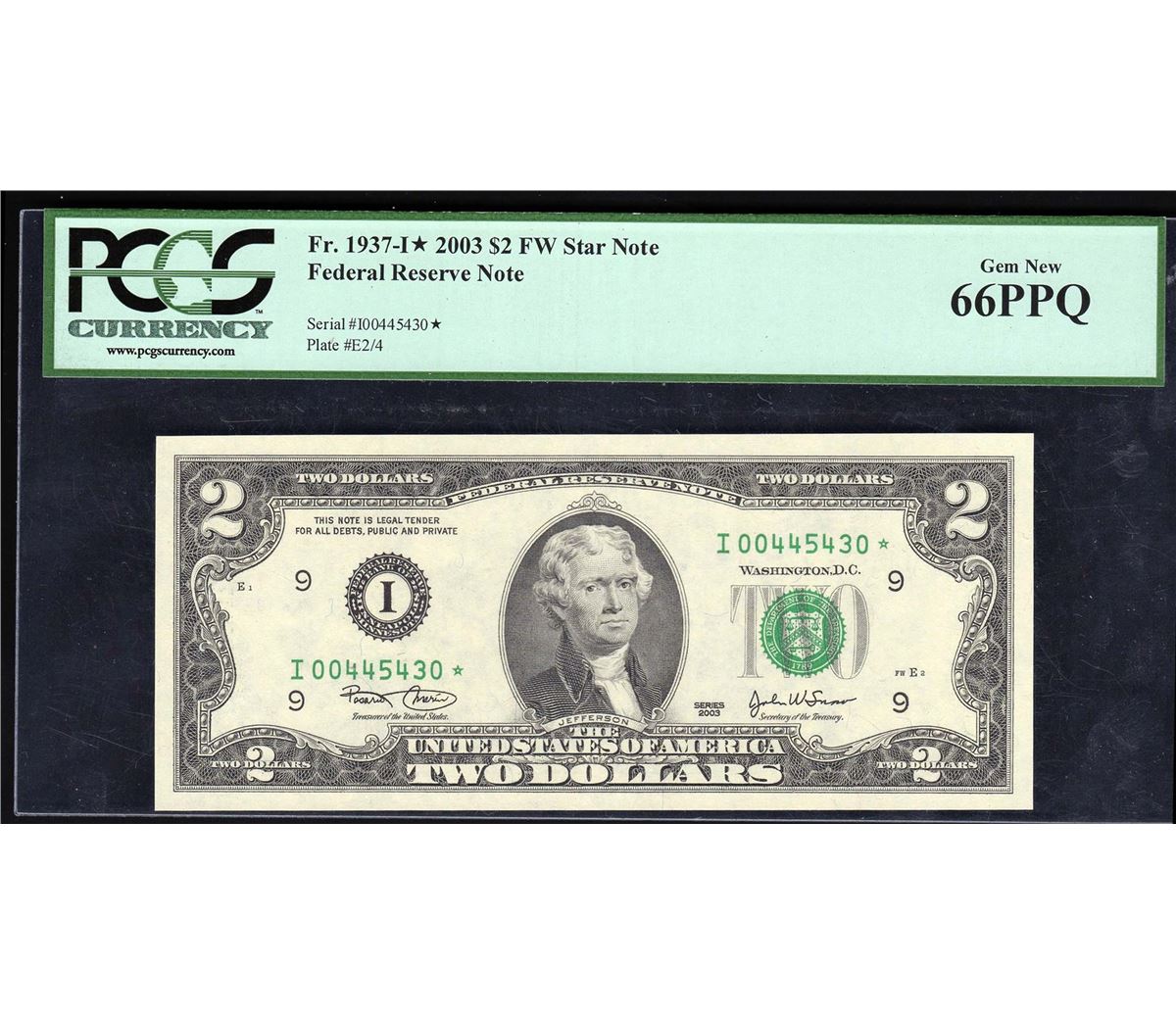 One 2003 $2 Federal Reserve STAR Note PCGS 66PPQ Gem New. PCGS Graded.