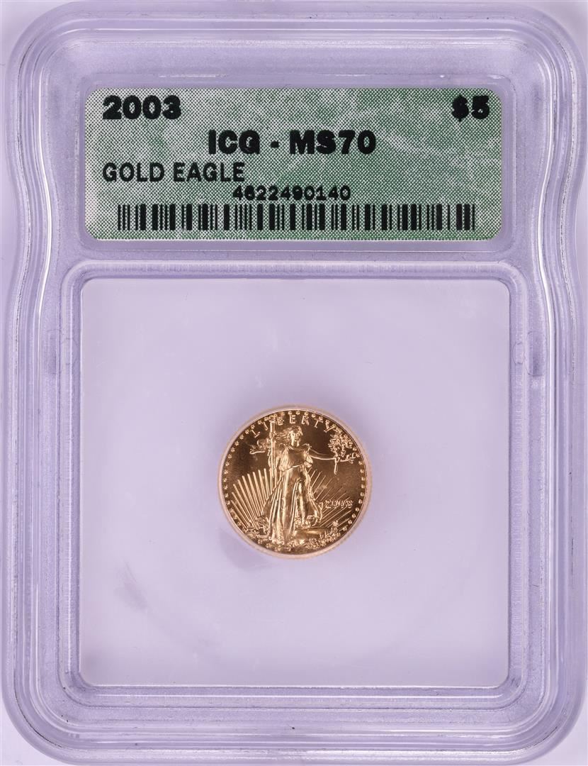 One 2003 $5 American Gold Eagle Coin ICG MS70. ICG Certified.