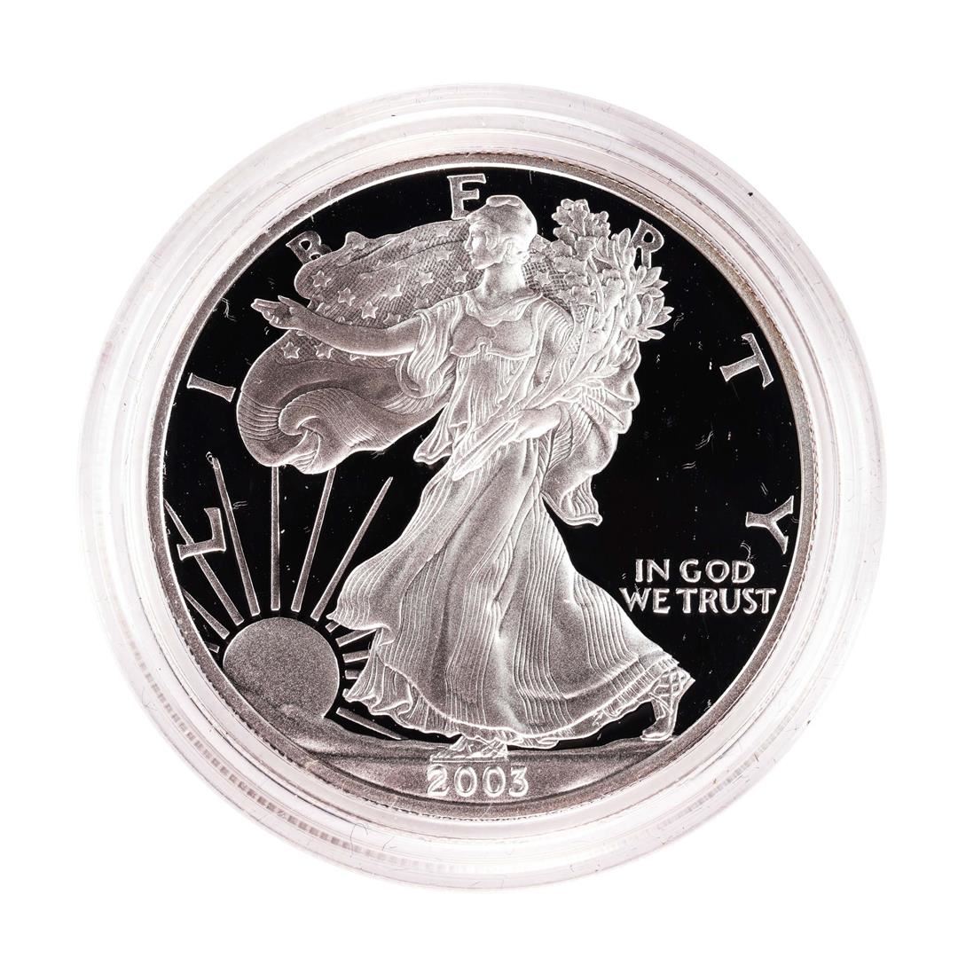 One 2003-W $1 Proof American Silver Eagle Coin.