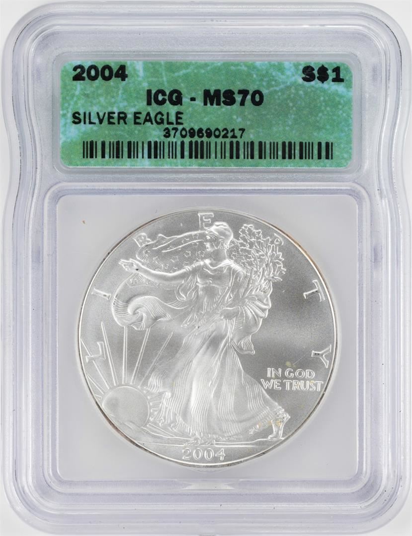 One 2004 $1 American Silver Eagle Coin ICG MS70. ICG Certified.