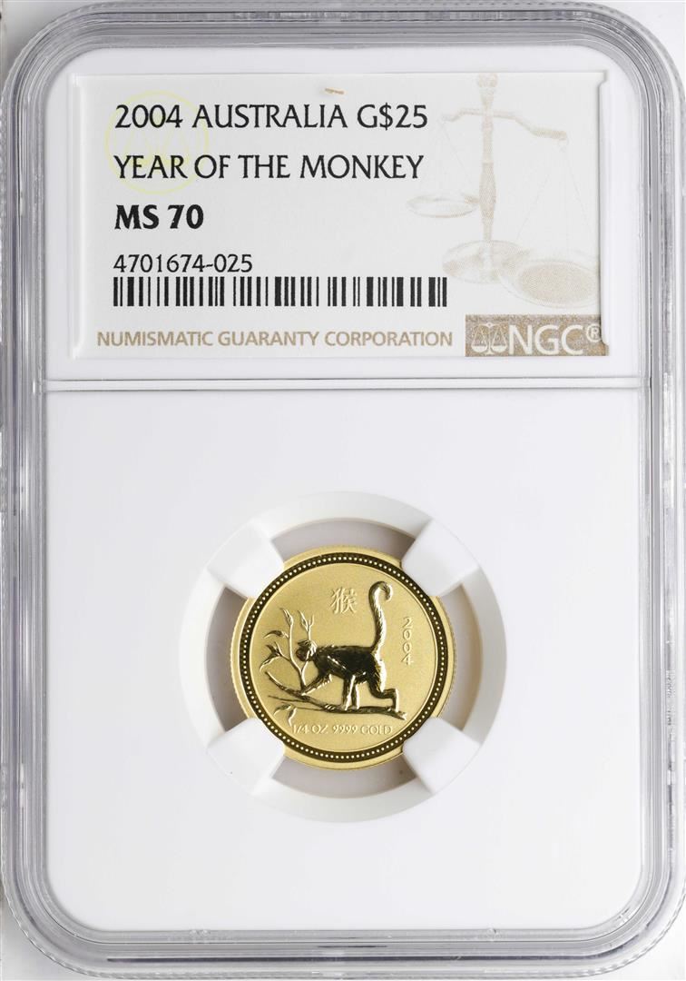 One 2004 $25 Australia Year of the Monkey Gold Coin NGC MS70. NGC Certified.