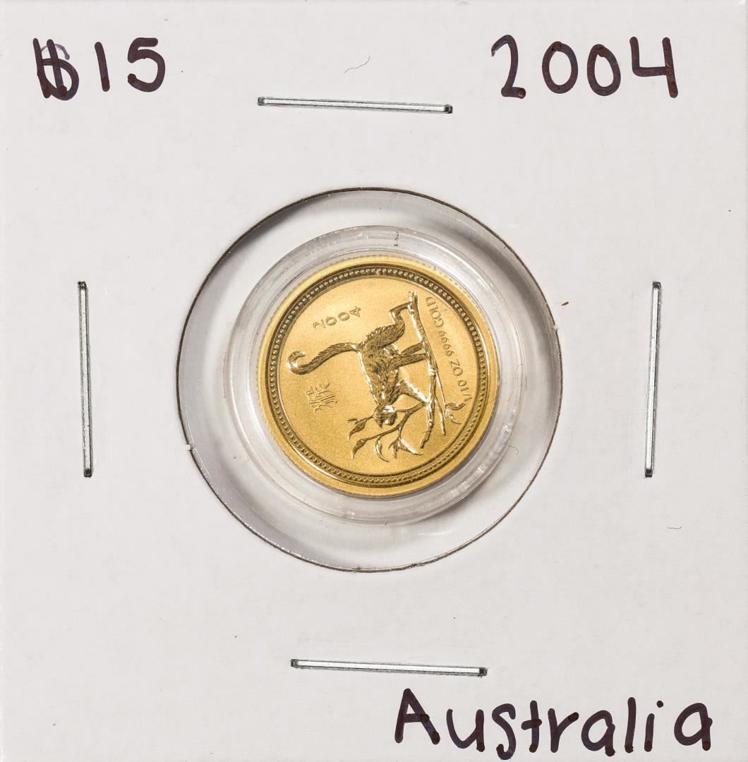 One 2004 Australia $15 Year Of The Monkey 1/10 oz Gold Coin.