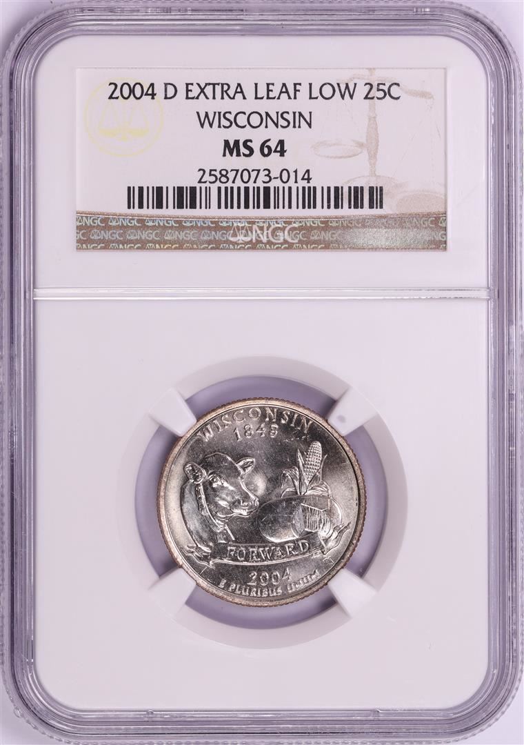 One 2004-D Wisconsin Extra Leaf Low Quarter Coin NGC MS64. NGC Certified.