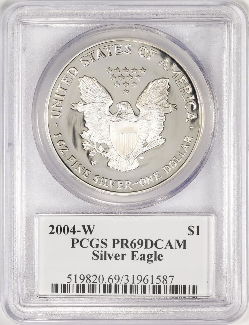 One 2004-W $1 Proof American Silver Eagle Coin PCGS PR69DCAM Mercanti Signed. PCGS Graded.