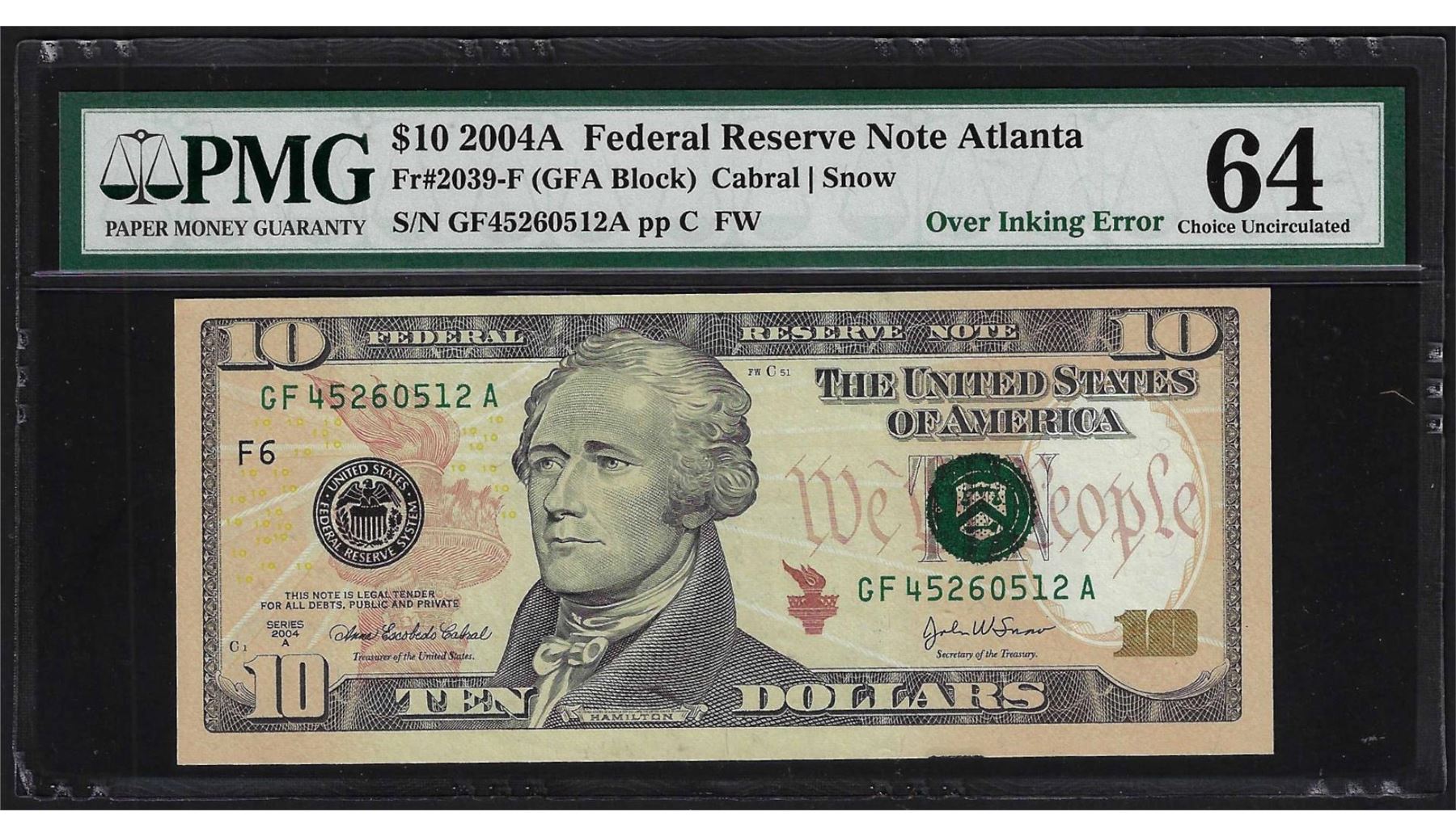 One 2004A $10 Federal Reserve Over Inking Error Note Fr.2039-F PMG Choice Uncirculated 64. PMG Certified.