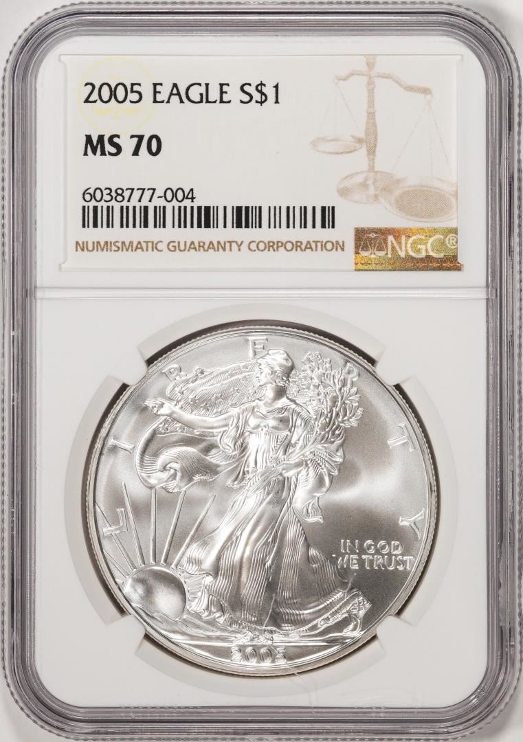 One 2005 $1 American Silver Eagle Coin NGC MS70. NGC Certified.