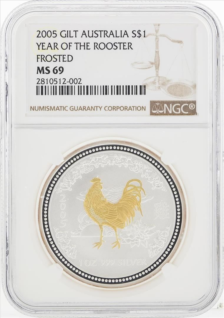One 2005 $1 Gilt Australia Year of the Rooster Frosted Silver Coin NGC MS69. NGC Certified.