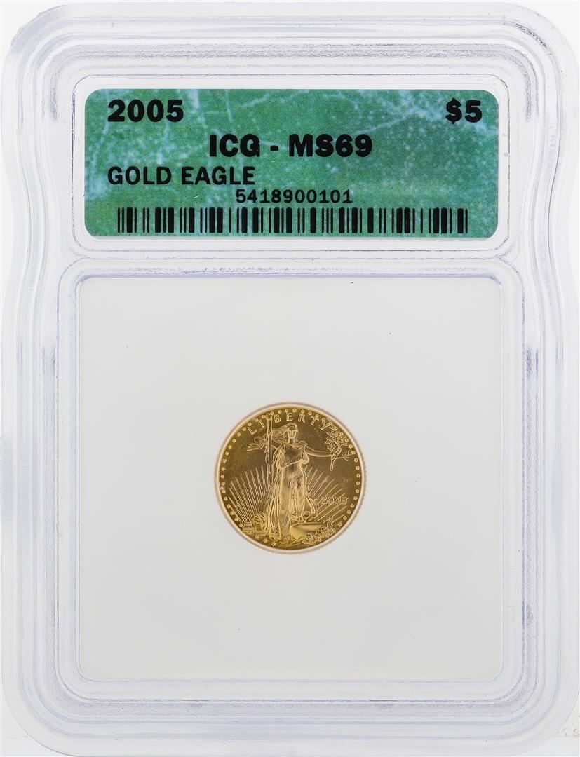 One 2005 $5 American Gold Eagle Coin ICG MS69. ICG Certified.
