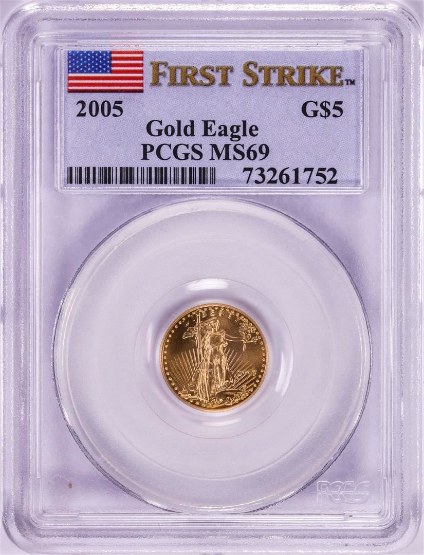 One 2005 $5 American Gold Eagle Con PCGS MS69 First Strike. PCGS Graded.