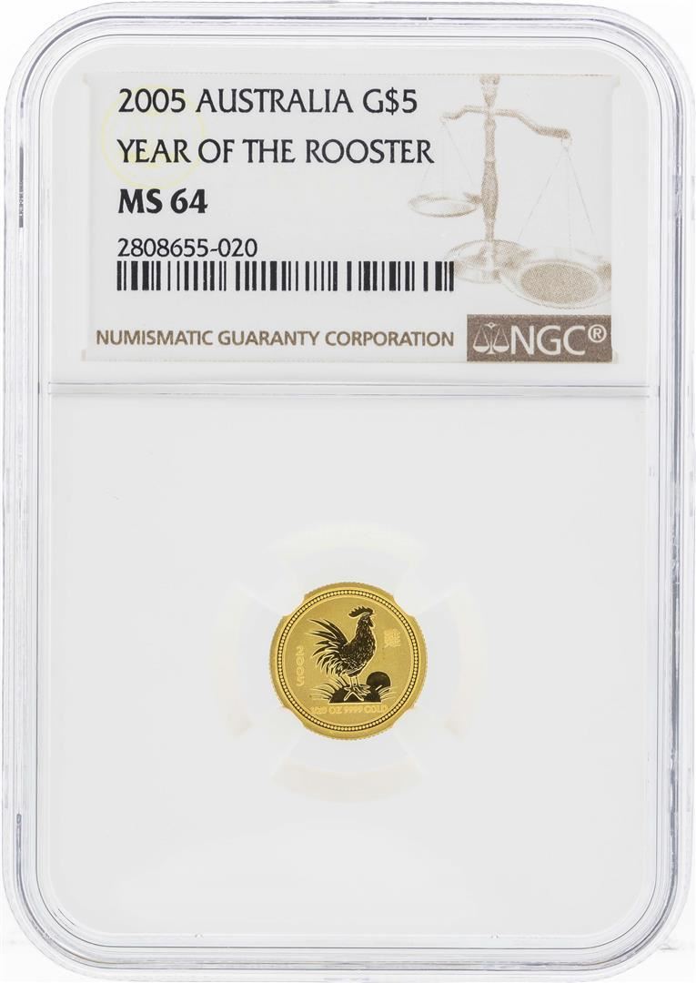 One 2005 $5 Australia Year of the Rooster Gold Coin NGC MS64. NGC Certified.