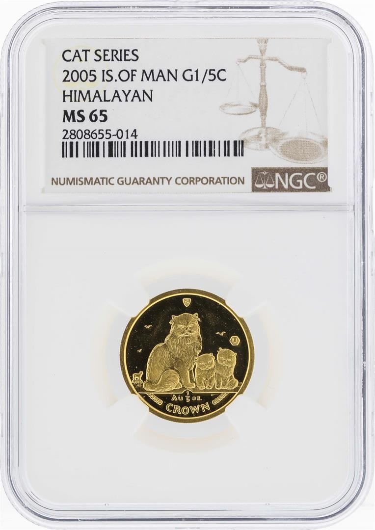 One 2005 Isle of Man 1/5 Crown Himalayan Gold Coin NGC MS65. NGC Certified.