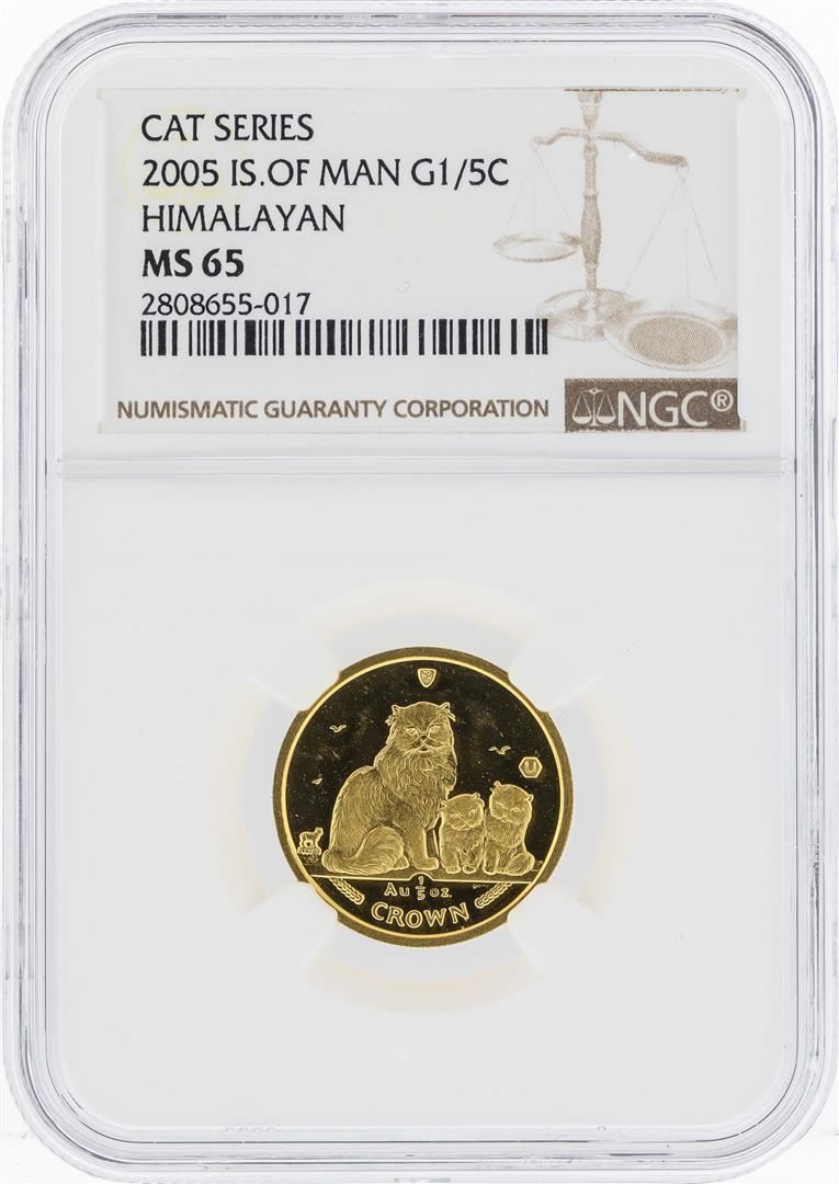 One 2005 Isle of Man 1/5 Crown Himalayan Gold Coin NGC MS65. NGC Certified.