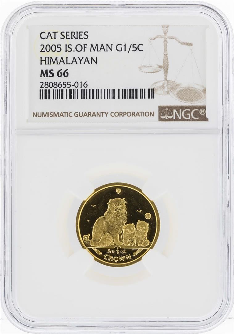 One 2005 Isle of Man 1/5 Crown Himalayan Gold Coin NGC MS66. NGC Certified.