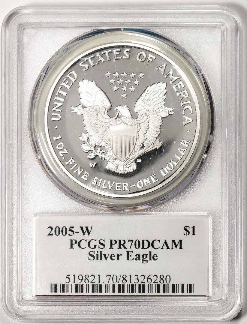 2005-W $1 Proof American Silver Eagle Coin PCGS PR70DCAM Mercanti Signature