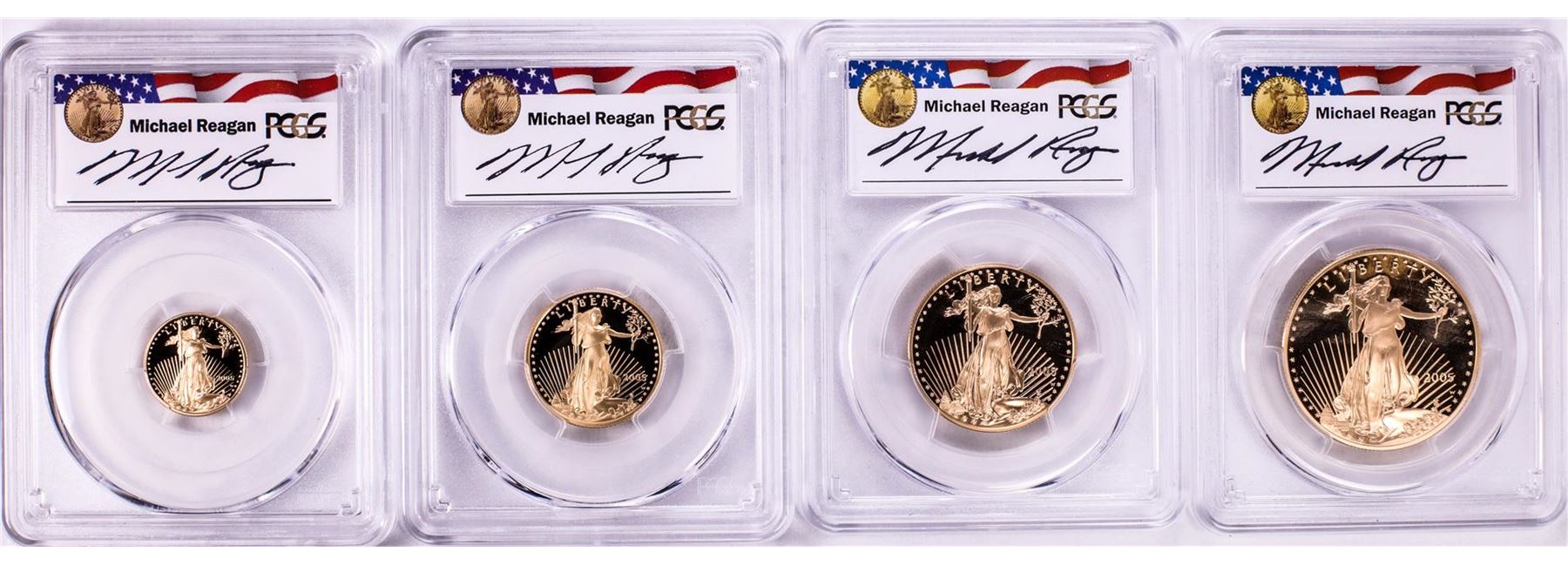 One 2005-W Proof American Gold Eagle (4) Coin Set PCGS PR70DCAM Michael Reagan Signature. PCGS Graded.