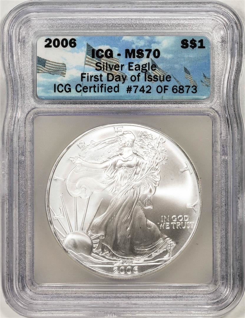 One 2006 $1 American Silver Eagle Coin ICG MS70. ICG Certified.