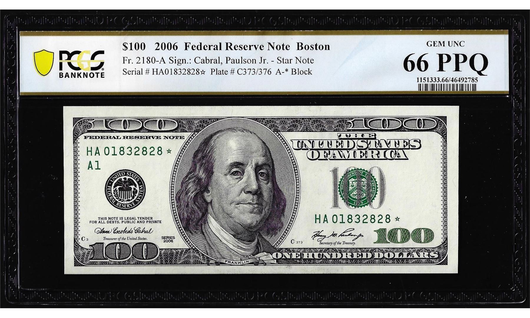 2006 $100 Federal Reserve Star Note Boston Fr.2180-A* PCGS Gem Uncirculated 66PPQ