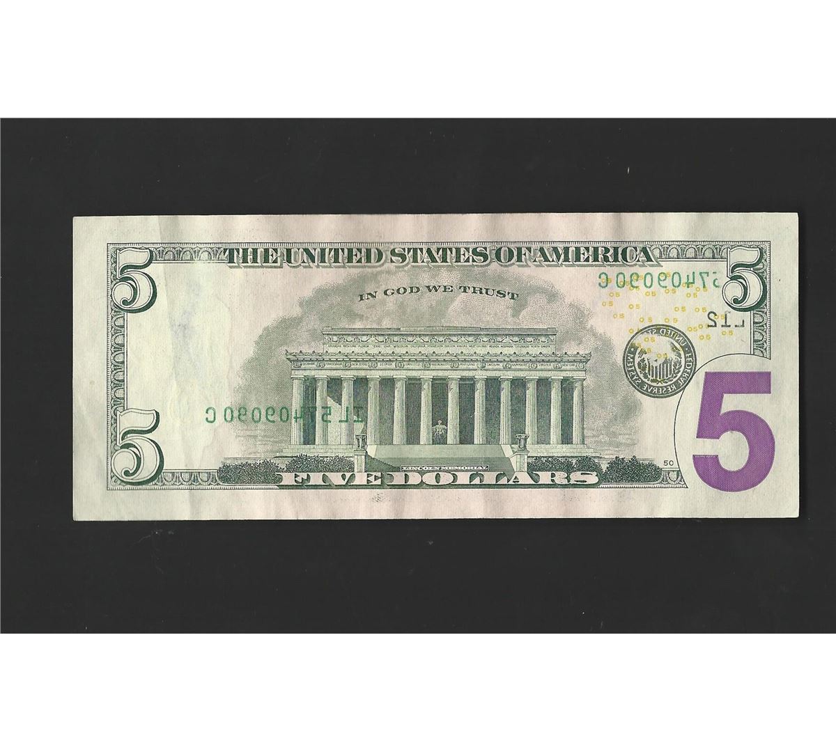 One 2006 $5 Federal Reserve Bank Note ERROR Ink Transfer on Reverse.