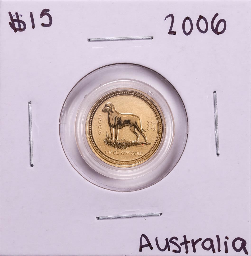 One 2006 Australia $15 Year Of The Dog 1/10 oz Gold Coin.