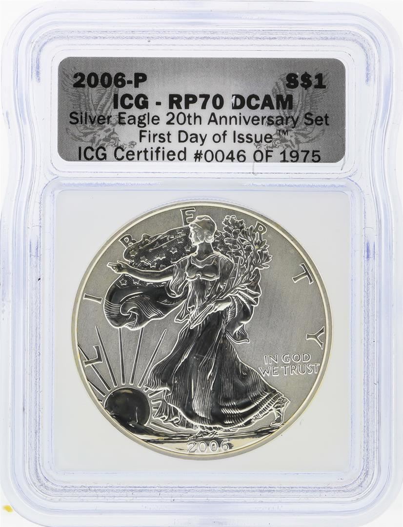 One 2006-P $1 American Silver Eagle Coin First Day Issue ICG RP70DCAM. ICG Certified.