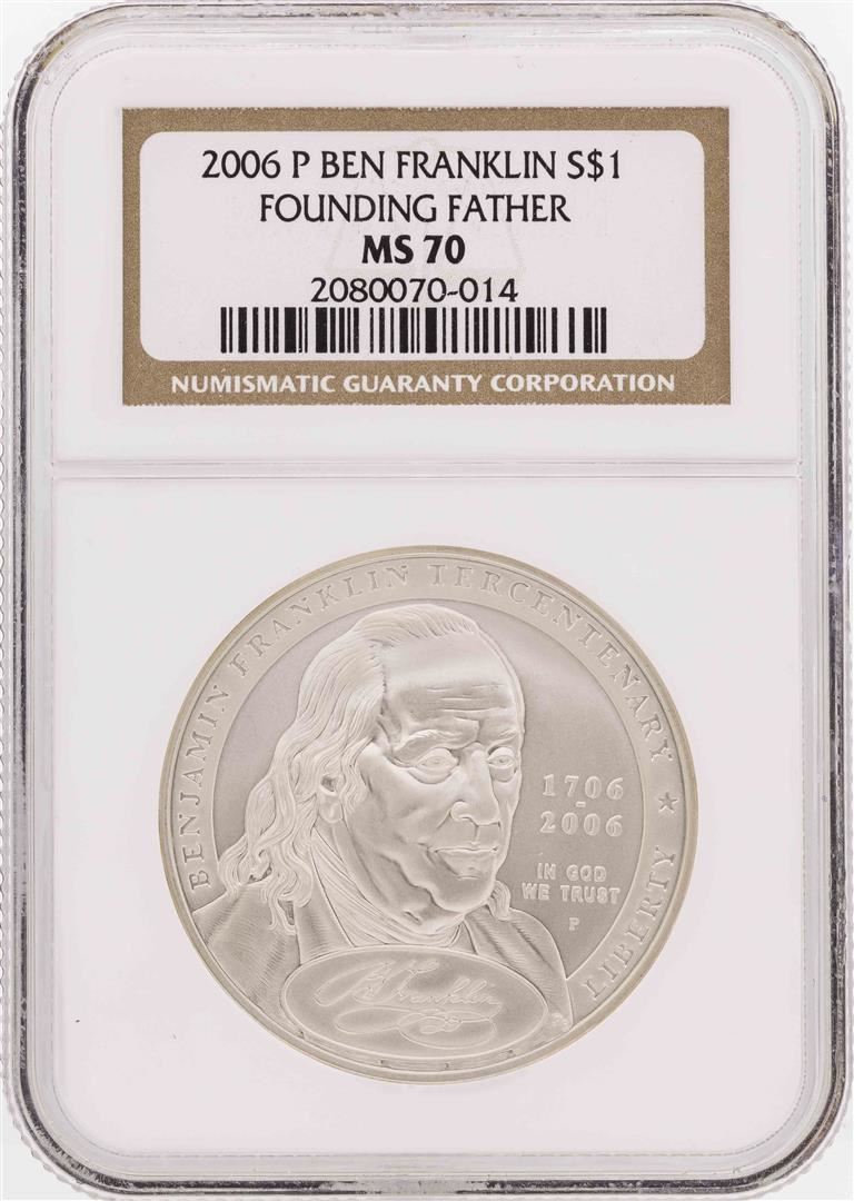 One 2006-P $1 Ben Franklin Founding Father Commemorative Silver Dollar Coin NGC MS70. NGC Certified.