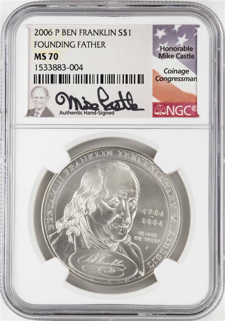 2006-P $1 Ben Franklin Founding Father Silver Dollar Coin NGC MS70 Mike Castle Signature
