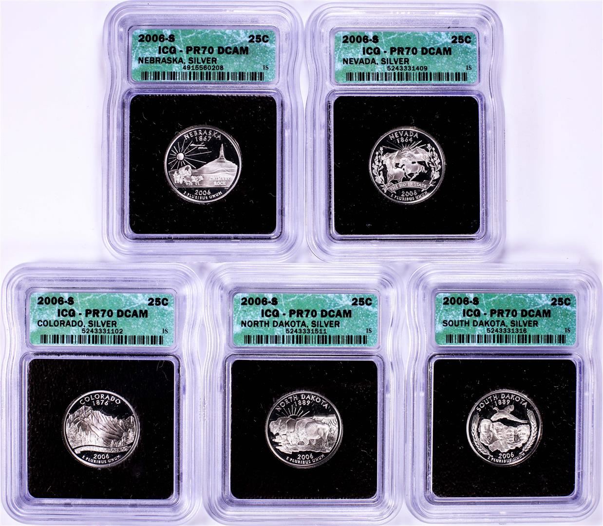 One 2006-S Silver Proof State Quarter (5) Coin Set ICG PR70DCAM.