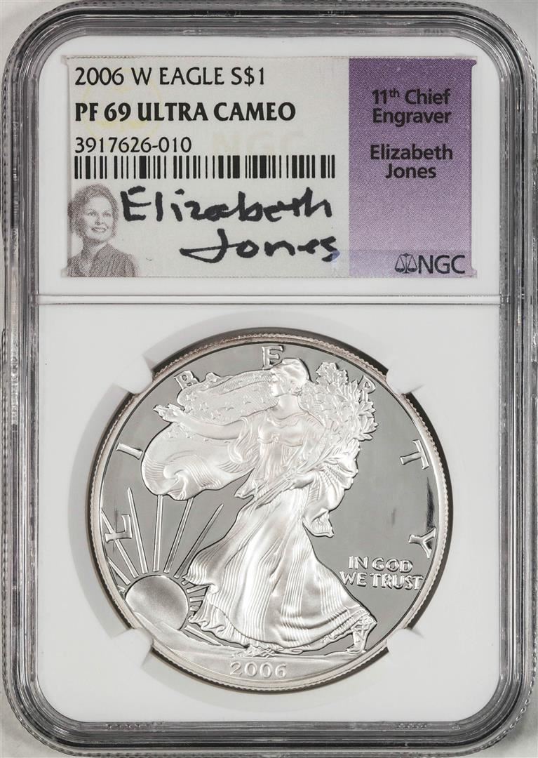 One 2006-W $1 Proof American Silver Eagle Coin NGC PF69 Ultra Cameo Elizabeth Jones Signature. NGC Certified.