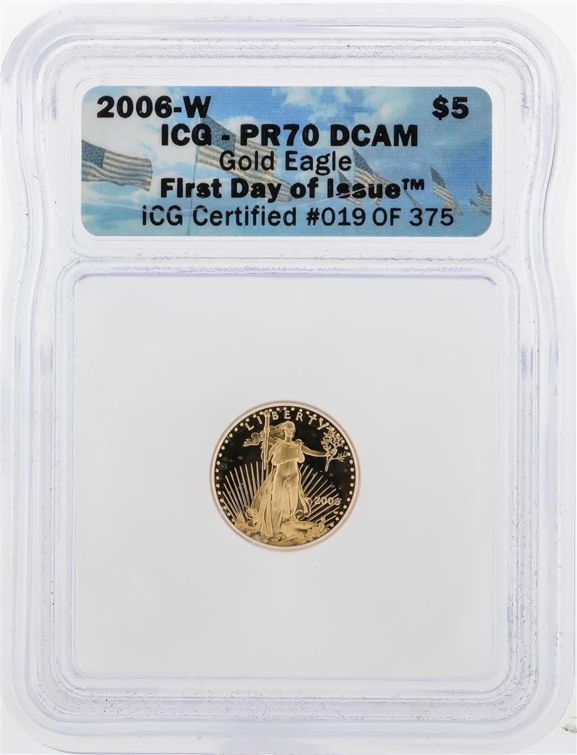 One 2006-W $5 American Gold Eagle Coin ICG PR70 DCAM. ICG Certified.