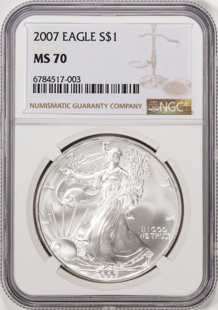 One 2007 $1 American Silver Eagle Coin NGC MS70. NGC Certified.